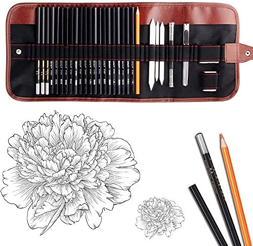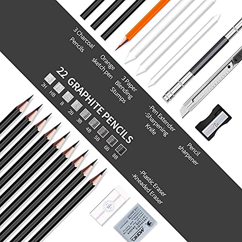 Package Include: 18 X Sketch Pencils (HB/1, B/1, 2H/2, 2B/4, 3B/2, 4B/4, 5B/1, 6B/1, 7B/1, 8B/1), 1 x Orange Colour Pencil , 3 X Charcoal Pencils (Soft, Medium and Hard) Each, 2 X Eraser, 1 X Pencil Sharpener, 1 X Pencil Extender, 1 X Pencil Case, 1 X Color Drawing Pen.
