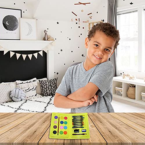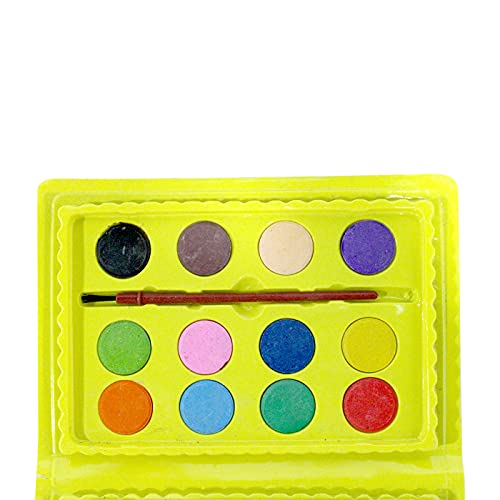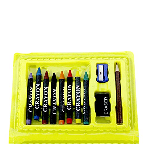 8 Wax Crayons, 12 Water Colors, 1 Color Pencil, 1 Brush, 1 Eraser And 1 Sharpener.