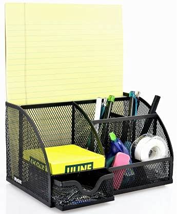 Features 6 compartments + 1 mini sliding drawer for pads, papers, pen/pencils, note pads, supplies etc