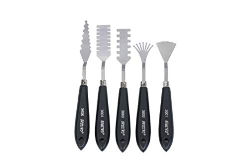 The ergonomically designed handles of Brustro artists’ special effects palette knives add increased comfort and grip to every application. Perfect for professional artists, creative hobbyists, art students and art teachers. This full range of 5 special effects knives offers the right combination of stainless steel resilience and flexible spring to facilitate any painting application like gesso, acrylic paint, modeling paste and texture gels. The bend in handles keeps the artist’s hands off the painting surface.
