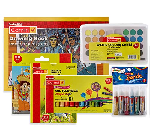 Everything your child will need to begin painting. Camlin presents a range of good quality, non-toxic water colours in cake form with excellent colouring strength developed specially for students. Item includes: Box of Water Colour Cake – 24 shades, Drawing Book – 1 quantity, Sketch pen (12 Shades), 4 Brushes .