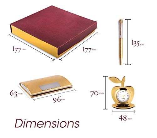 An apple shaped decorative time piece comes with this gift set. It is a useful and stylish accessory. It can be placed on the table, or even inside a car. The watch is compact and portable in size.