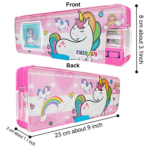 LED LAMP LIGHT & CALCULATOR: This 2-sided CHIRPLY brand stylish pencil box comes with a real working calculator and a detachable LED lamp light. It has 2 built-in sharpeners with waste storage, and magnetic straps for automatic closure. LARGE CAPACITY GADGET: This dual-sided compartment case has big storage to hold all your child’s school stationaries like set of pens, pencils, eraser, clips, crayons, sharpeners, rubbers, rulers, and maths set. PERFECT GIFT: This multi-functional box is an ideal gift for your child, relatives, and friends on their birthdays. Use this animation cartoon themed box as return gift. Use this superhero themed box as kids’ toys. QUALITY ASSURANCE: Premium quality pencil case. 100% brand new product. Made of durable and 100% BPA free plastic. All parts are individually tested before shipping. CHIRPLY BRAND: Buy this CHIRPLY brand product with confidence. Follow the main image for list of accessories and characters included with this product.