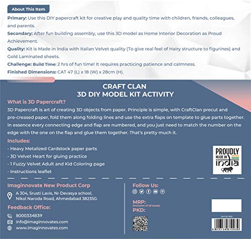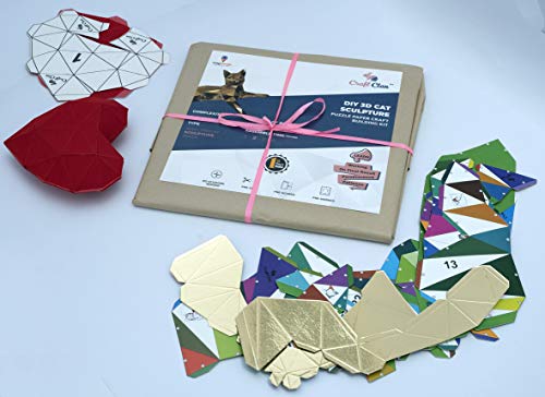EASY YET CHALLENGING: Assembly time: 2.5 hrs. Finished dimensions: 47 (L) x 18 (W) x 28 (H) cm. Packaged with easily comprehensible instructions, Pre-cut, Folds-prepared cardboard, numbered edges for ease of assembling, and Fuzzy Heart for practice. Our 3D Gold Metallic Cat Sculpture Puzzle is fun to construct but still challenging enough to require patience, precision, and calmness