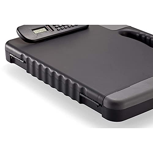 Combination clipboard and portable office. It can even be used as a briefcase. Large capacity for papers, forms, notepads, etc. The heavy-duty clip has a built-in dual battery/solar-powered calculator. Three separate filing compartments for pens and pencils, clips, and other small objects. One compartment is magnetized to hold clips in place. Includes built-in pockets for CDs, business cards, and papers. Hang hole. Six inner compartments to store papers, pens, pencils, CDs, scissors, ruler, etc. in a 3/4-inch deep section; secure closure keeps contents secure; smooth writing surface lets you write neatly; strong spring clip helps secure papers; made from durable plastic. Whether traveling, on-site, in the field, or in the office, storage clipboards combine storage, filing, and a firm clipboard writing surface with a strong clip. Coaches, teachers, estimators, field service reps, couriers, canvassers, drivers, fund-raisers, doctors/nurses/EMTs, police, firefighters in fact any act