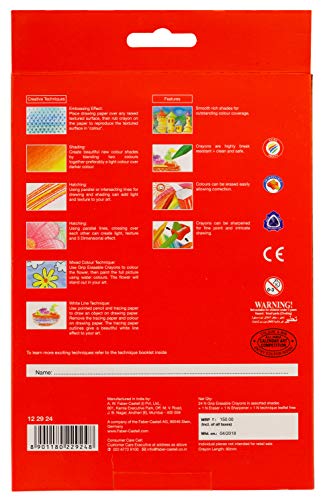 Faber-Castell Triangular Colour Pencils – Pack of 24 (Assorted)Best of class color pencils with smooth color rich leads and special bonding that offers good sharpen ability and high break resistance. Phthalate free lacquer on our pencils makes it safe for children. Soft lead-no pressure required for coloring. Rich, smooth and easy spread provides good coverage. Highly light fast-does not fade when exposed to sunlight. Even lead stroke-non scratchy. Reduced lead breakage due to special bonding process.Faber-Castell Grip Erasable Crayon Set – Pack of 24 (Assorted)Triangular shape plastic crayon with unique “non slip grip surface” that gives better comfort and control for tireless drawing and coloring. Erasable with vinyl and natural erasers. Good sharpen ability. No flaking of colors-clean hands. Fragrance free-safe for children. Ultra smooth and easy flow of colors. Can be used from both ends-the tip for fine coloring and the end for covering larger surface area. Colors can be erased easily allowing correction. Free eraser and sharpener.