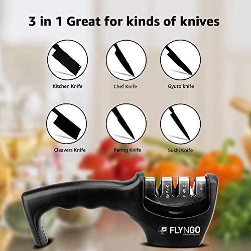 Keep cooking fun, safe, and healthy with the Knife Sharpener by FLYNGO, Our 3-step system begins with a diamond rod slot that gently repairs and straightens damaged blades. You can even use it for ceramic knives! Next, tungsten steel provides coarse sharpening that restores the blade to a V-shape before the 3rd slot creates a stunning polish.