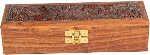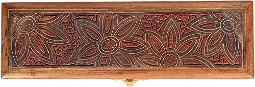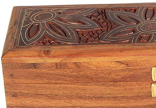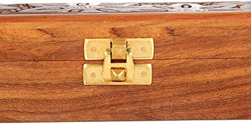 This hinged wooden jewelry box with beautiful decorative hand carved drawing and inlay work has been handmade by artisans of pilkhua in utter pradesh state of north india Jewelry boxes are thoughtful gifts for women and girls, as they can be treasured for years to come and displayed in a special place where they can be seen daily. If you’re looking for a cheap jewelry box to give as an inexpensive gift to someone special but still want to make sure that lovely lady or girl gets a gift of the absolute finest quality, our Handmade Indian Wood Jewelry Box is the perfect choice. Our jewelry box for girls and women is a design you won’t find in stores or anywhere else on Amazon. Each of jewelry box is handcrafted out of sheesham wood, an Indian renowned for its durability and handsome natural grain. The Handmade Indian Wood Jewelry Box is made with traditional techniques that have been passed down through generations of artisans from Saharanpur, India. The skills of these woodworkers are world renowned and make this jewelry box truly beautiful and capable of standing the test of time. On the lid of the Handmade Indian Wood Jewelry Box is a beautiful motif produced out of inlaid brass. The technique is called tarkashi and involves carefully hammering pieces of genuine brass into engravings in the wood. Small holes are punched into the flowers to add a pleasing texture to the design. The careful attention to detail makes the jewelry box more than just a place for storing earrings, bracelets, rings and necklaces. The piece doubles as a decorative item that can be displayed anywhere in the home. The Handmade Indian Wood Jewelry Box measures 8 inches by 2.5 inches by 2 inches outside. Inside, the box’s dimensions are 7.25 inches by 1.75 inches by 1 inch. The box features a brass clasp and brass hinges to complement the color of the inlay. Choose a cheap jewelry box that is low in price but not cheaply made.