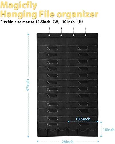 【Material & Size】Our wall file folder organizer well-made of sturdy 600D cloth and reinforced medal hooks and holes, Eco-Friendly, non-toxic and wear-resistant. Length: 47″ – Width: 28″. Total 24 pockets and 6 tool pockets, each pockets dimensions Width: 13.5″ – pocket depth: 6.8″, Suitable for A4 files and your 13inch notebook or iPad.