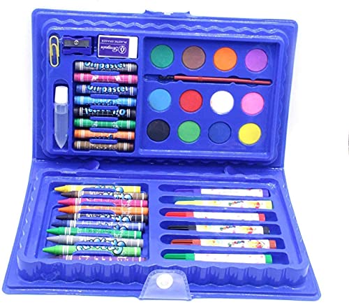 Colour box with multiple coloured pens, crayons, water colours, oil pastes, pencils