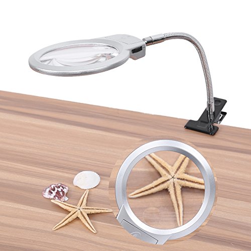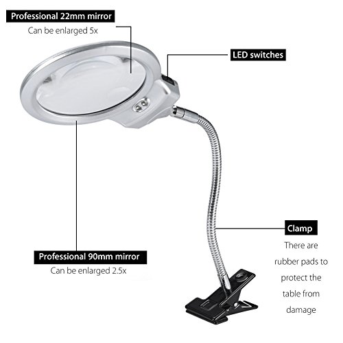 Acrylic and ABS material is durable and environmental. Soft metal hose can be bent freely at any different angles to adjust lens’ height and position and meet your different needs. Ideal for people who are involved in fine work such as coins, stamps, jewelry, embroideries and so on. 2 magnifiers with 2.25x and 5x magnification allow you to get an extremely close view of the tiniest details. 2 led lights ensure you can work under insufficient light environment. Lens frame can protect the lens from damaged for long time use.