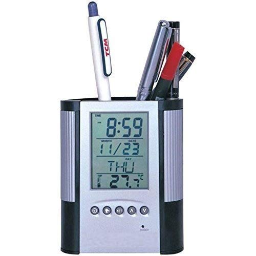 Description : – This Pen Holder is Everything you need to keep you on track with your schedule. – Pen Holder round mesh alarm clock pen holder with calendar and temperature will solve this problem. – This multifunction pen holder is combined with a pen holder, alarm, and calendar An electronic face provides the date and time. – Elaborate design, it also has lights on the sides giving it an aesthetic appeal. And the addition of an alarm facility will make it even more interesting. – Pen holder makes your desk looked clean and tidy, also is a great addition to your desk. And this metal pen holder is made of high-quality material for long time use.