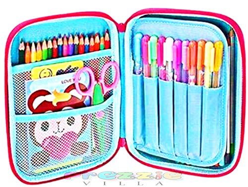This amazing cute design hardtop pencil case. It opens like book, unzipping from 2 sides with 2 puller. You will find 2 mesh pocket, 6 pencil slots on inter layer and more space under inter layer to store pens, pencils, colored pencils,markers, erasers, scissors, protractors, small notebooks and much more. This pencil case will keep stationary secure and organized. and will help to develop children’s storage habit.