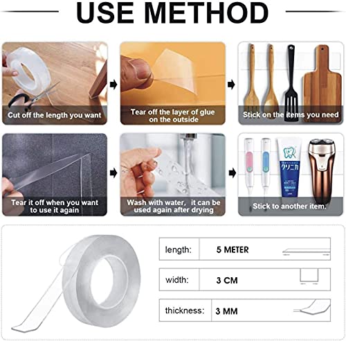 Unique size: length 5m/16.5FT ,width 30mm ,thickness 2mm.Holds up to 1 KG(2.2 LBS)on a smooth surface, this double-sided tape can stick to almost any smooth ,easy to disassemble without damaging surface, so that you can arbitrarily paste anything.