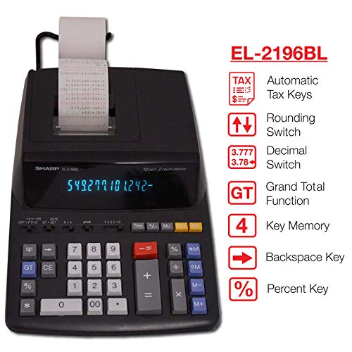 The EL-2196BL is a 12-digit desktop printing calculator with 12 digit display with 2 color printing. It has a VF display and prints at approximetely 3.5 lines per second. AC powered.