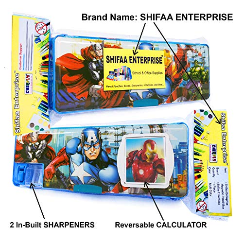 Shifaa Enterprise Kids Boys Girls Multipurpose Stylish Pencil Box and Accessories Case Pouch for School ✅ CALCULATOR AND DUAL-SHARPENER: This 2-sided pencil box comes with a calculator at the top for your kids to aid in quick calculation. This stylish pencil case also has 2 built-in sharpeners for different types of pencils and color pencils. Uses magnetic straps on both sides for opening and closing. ✅LARGE CAPACITY: This 2-sided storage pencil case is big enough to hold all your school stationaries like set of pens, pencils, eraser, stapler, scissors, clips, pencil crayons, sharpener, rubbers, small size rulers, student’s calculator and maths set. Actual dimensions: 24 CM x 9 CM x 3 CM OR 9.5” x 3.5” x 1.5” (Inches). ✅ ATTRACTIVE DESIGN: Attractive design with your favorite cartoon character and color combination would make your child want to have this to school every day. ✅IDEAL GIFTING OPTION: Attractive design with your favorite cartoon character and color combination would make your child want to have this to school every day. Use it as a gift for your child, relatives and friends on their birthdays, they will like it. Use it as return gift for your child’s birthday. ✅QUALITY BPA FREE PLASTIC: Made of durable and quality BPA free non-toxic plastic material keeping kids in mind. Uses good quality magnetic straps that makes it easy to use. We assure of the quality of the product, please contact us for any manufacturing defects.