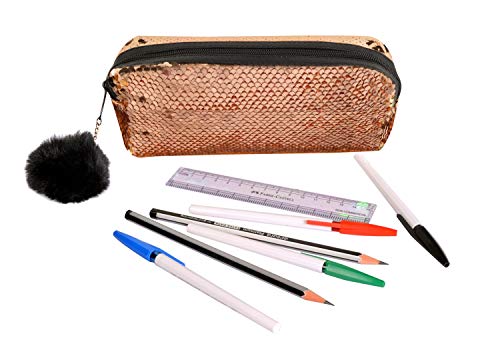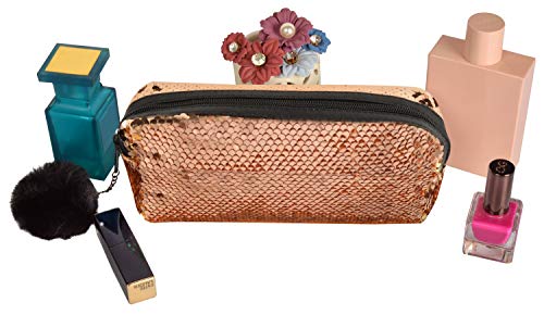 STRIPES beautiful reversible magic sequins color changing pencil / makeup pouch for women and girls . The bag is made of reversible sequin polyester blend and durable with smooth zipper .